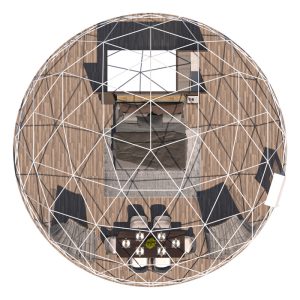- Kerek üvegablak (Ø 0,5 m) – természetes fényt enged be, kiemelve a gömb alakú kialakítást.